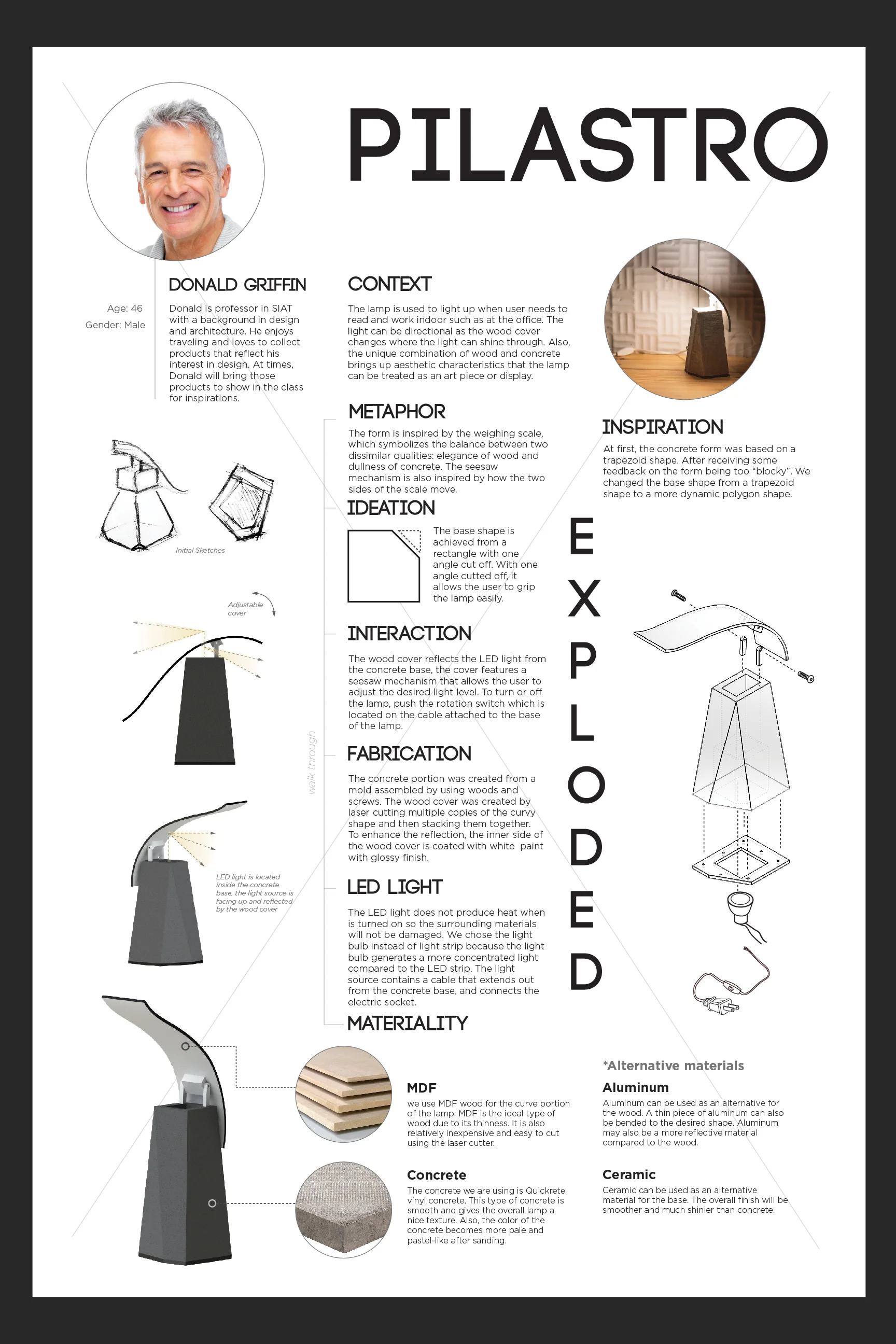 Pilastro is inspired by the weighing scale, which symbolizes the balance between two dissimilar qualities: elegance of wood and dullness of concrete. The seesaw mechanism is also inspired by how the two sides of the scale move. The concrete form was based on a trapezoid shape. After receiving some feedback on the form being too “blocky”. We changed the base shape from a trapezoid shape to a more dynamic polygon shape.